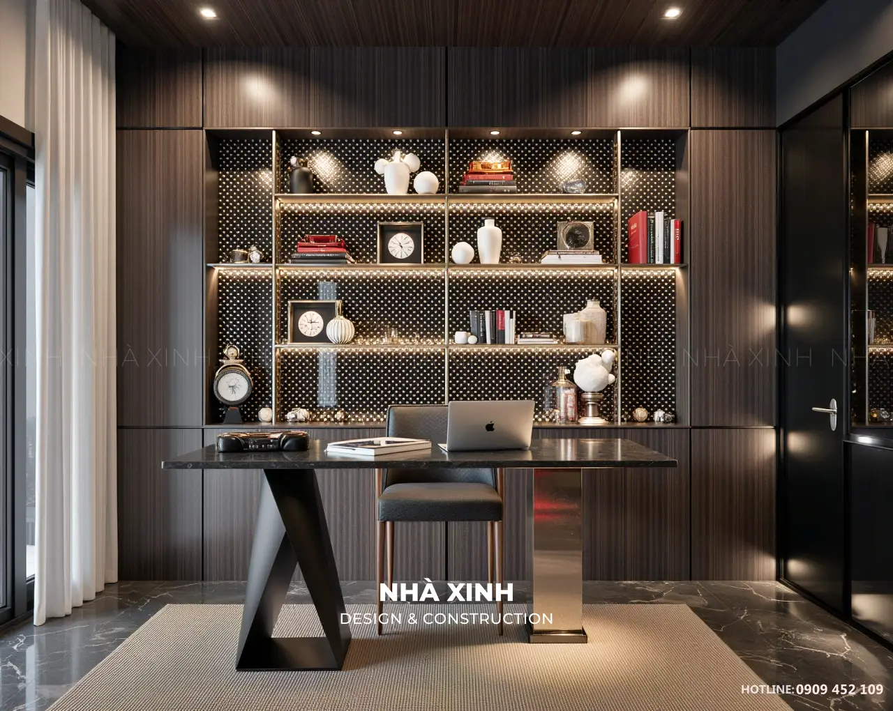 Thiết kế phòng làm việc bán cổ điển được định hình bởi những đặc trưng tinh tế, pha trộn hài hòa giữa hai trường phái: