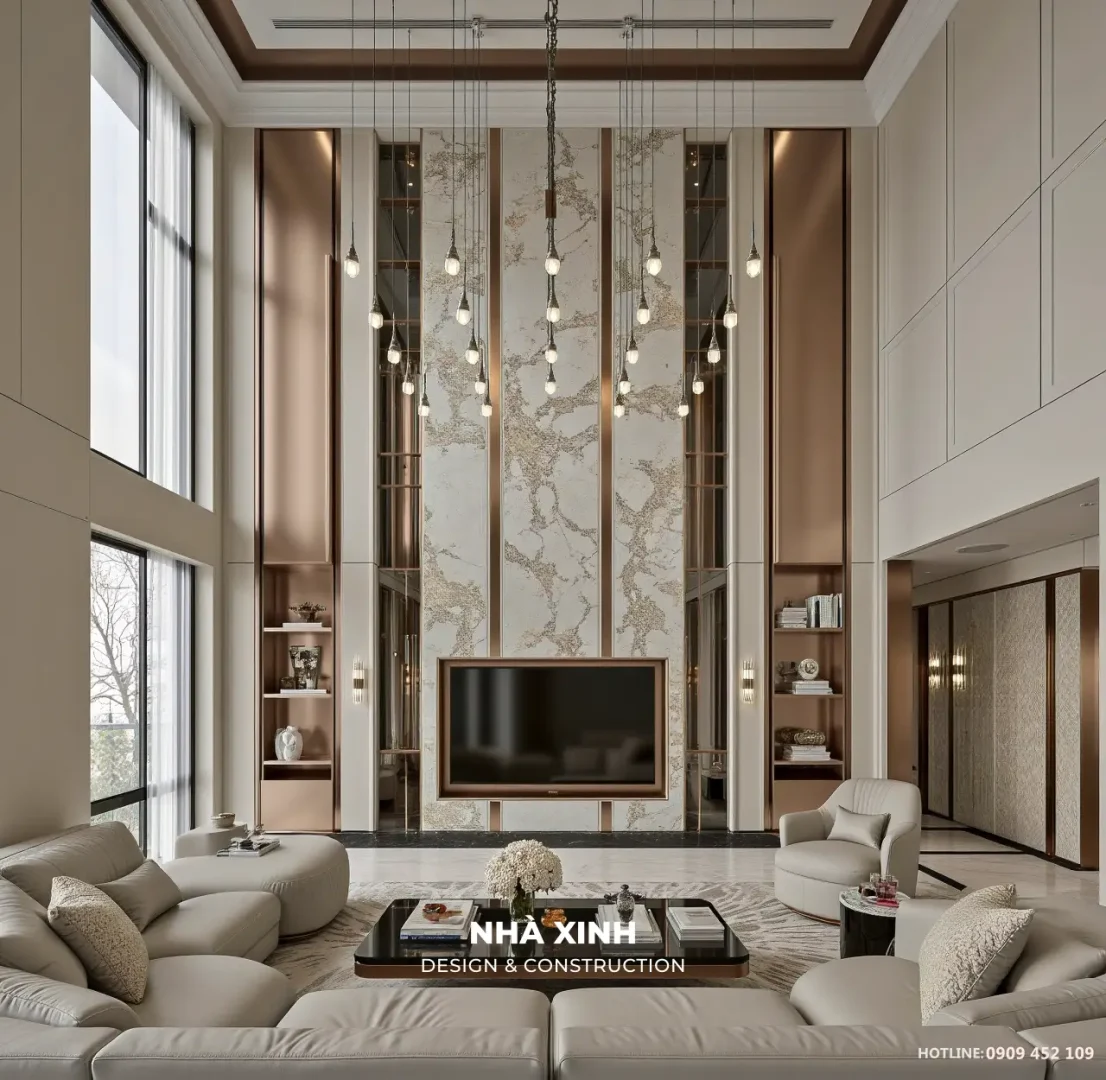 Nội thất tại The Luminous Haven là minh chứng cho tầm nhìn của Nhà Xinh về một không gian sống hiện đại, bền vững và tràn đầy ánh sáng. Chúng tôi tập trung vào việc tối đa hóa nguồn sáng tự nhiên thông qua hệ thống cửa kính lớn, giếng trời và bố cục không gian mở. Gam màu sáng, trung tính như trắng ngà, be, xám nhạt được sử dụng làm nền cho các chi tiết vàng đồng, pha lê, và các bề mặt bóng bẩy, tạo nên không gian bừng sáng và cảm giác rộng rãi. Ánh sáng tự nhiên không chỉ làm nổi bật vẻ đẹp của từng vật liệu cao cấp mà còn tạo ra các hiệu ứng đổ bóng và tương phản đầy mê hoặc. Hệ thống chiếu sáng nhân tạo được bố trí khéo léo để bổ trợ ánh sáng tự nhiên, biến không gian trở nên lung linh và ấm áp vào ban đêm. Verosa Park – The Luminous Haven không chỉ là một ngôi nhà, mà là một không gian sống đầy cảm hứng, nơi quý vị tận hưởng sự xa hoa, đẳng cấp và luôn được bao bọc bởi ánh sáng rạng rỡ, trường tồn.