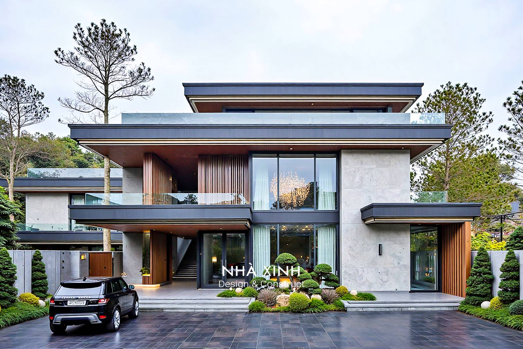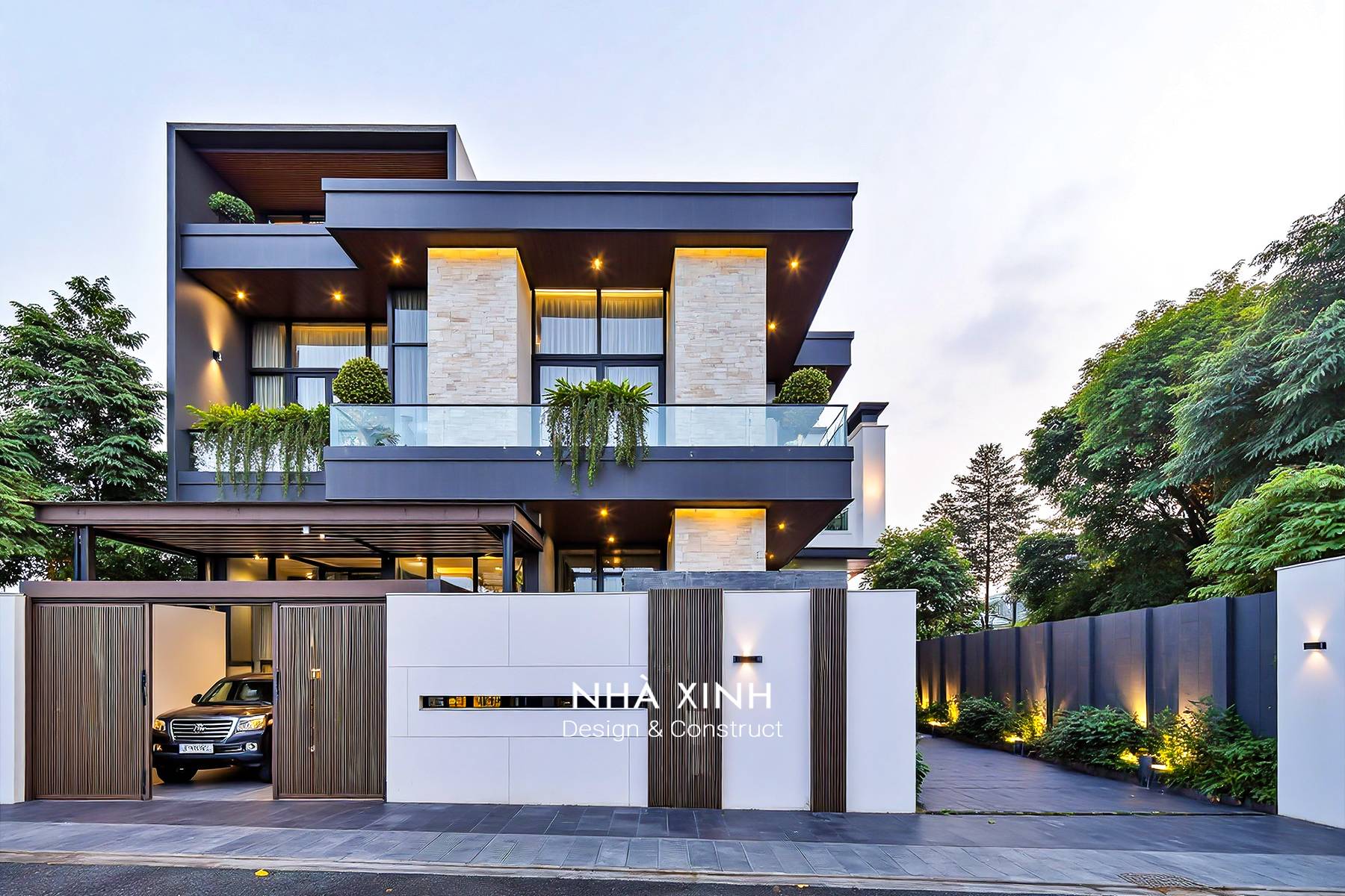 Tinh thần biệt thự hiện đại thể hiện qua đường nét chắc khỏe, hình khối vuông vức – mang lại cảm giác vững chãi, an toàn.