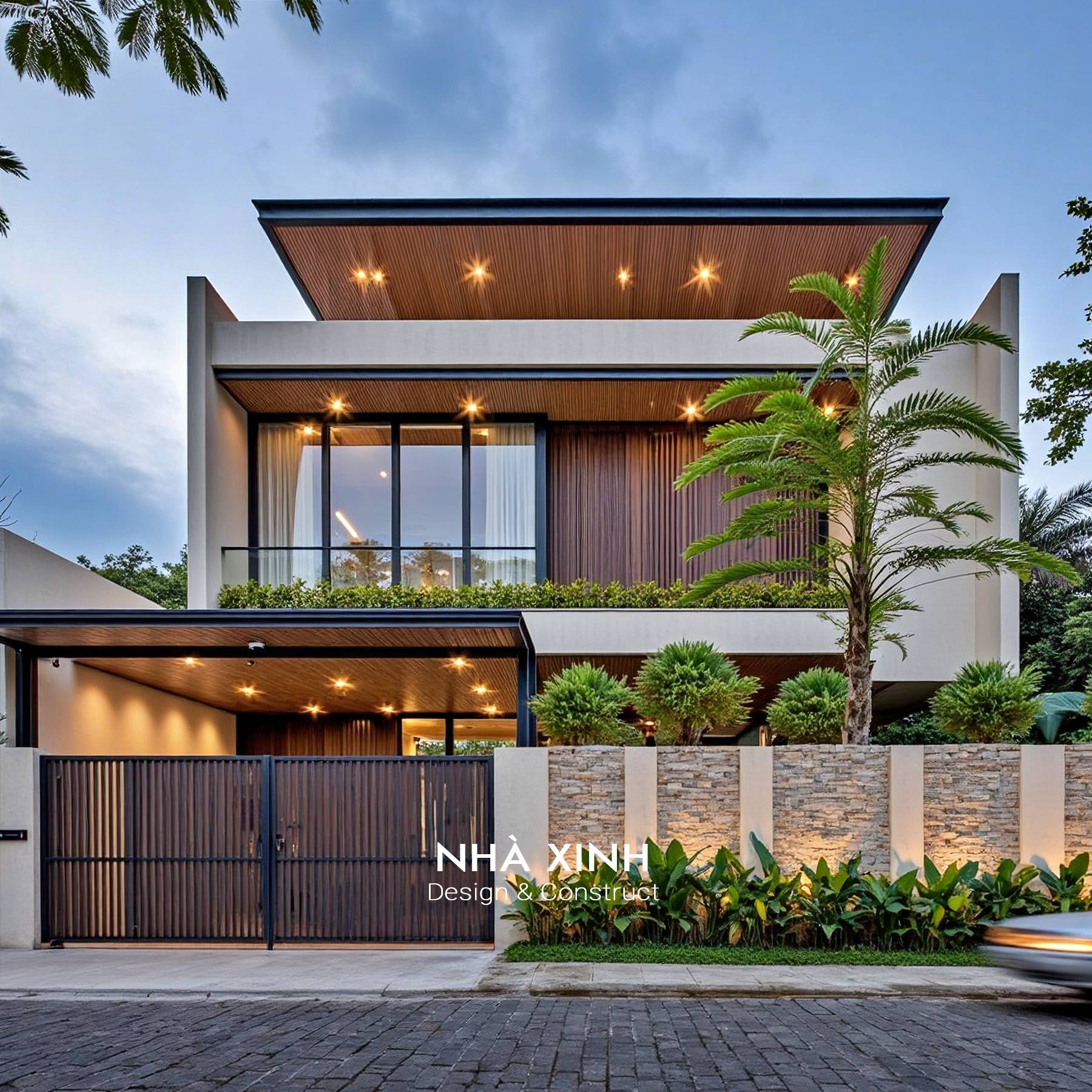 Các biệt thự hiện đại 2 tầng đẹp thường dùng tông sáng để mở rộng thị giác, nhấn nhá bằng vật liệu gỗ – đá – kim loại để tạo chiều sâu và đẳng cấp.