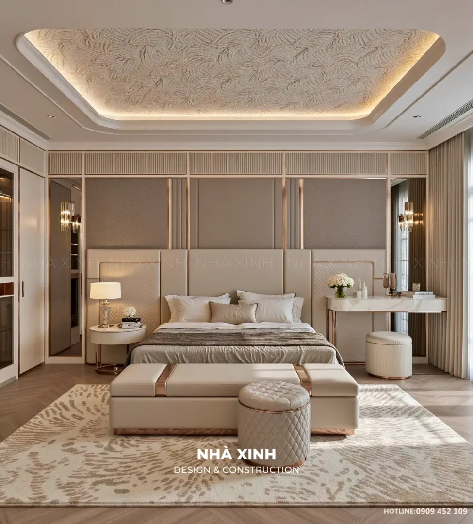 Giường ngủ chế tác riêng: Giường được thiết kế và chế tác riêng theo yêu cầu của gia chủ, đảm bảo tính độc nhất và phù hợp hoàn hảo với không gian. Đầu giường có thể bọc da hoặc nhung cao cấp, có các chi tiết chạm khắc tinh xảo hoặc đính đá/kim loại.