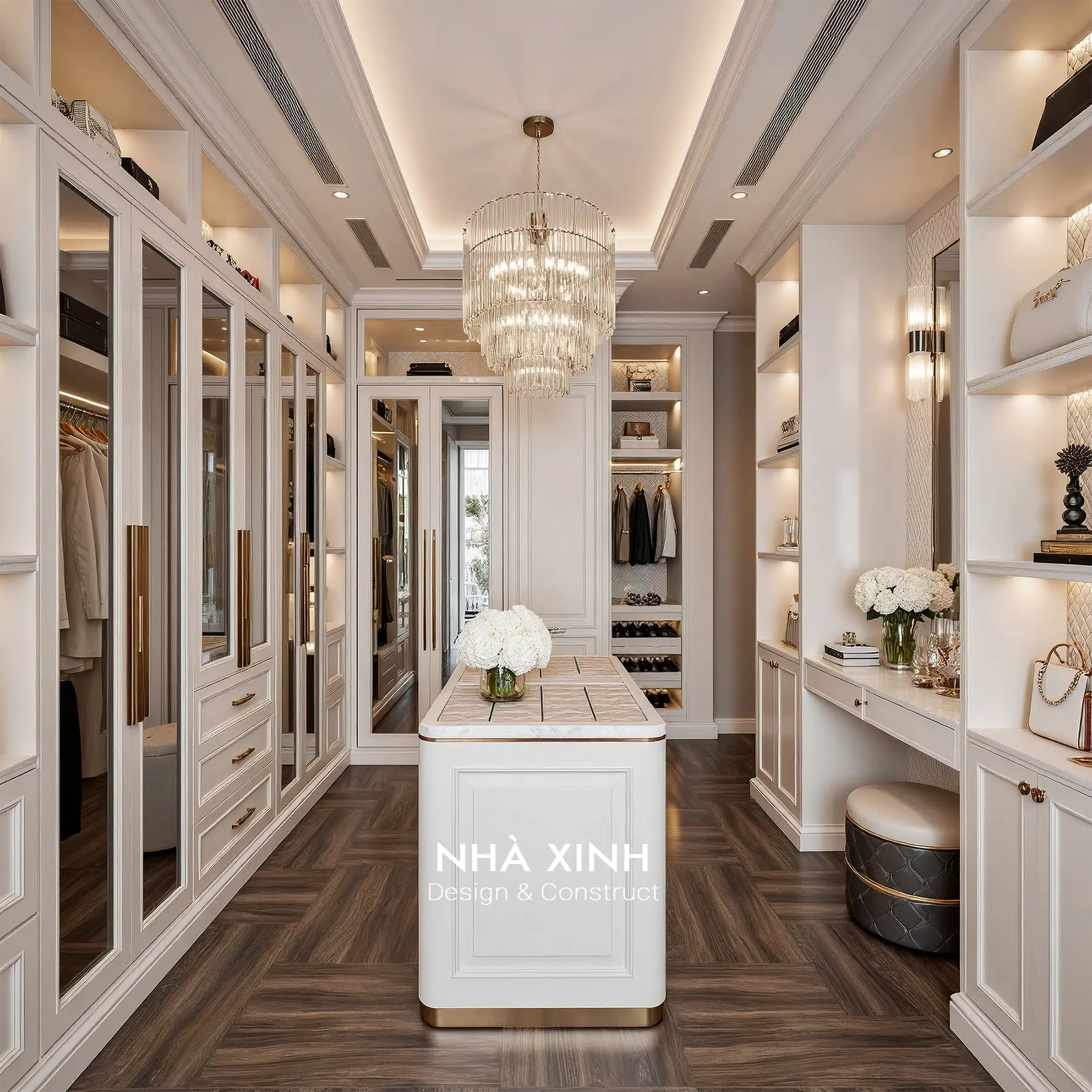 Phòng thay đồ được thiết kế như một boutique thu nhỏ, lối đi giữa rộng rãi với đảo trưng bày trung tâm khiến mọi thao tác hằng ngày trở nên “đã” và gọn. Tủ trắng cánh kính, tay nắm ánh vàng và đèn chùm pha lê làm không gian sáng sang rực rỡ, cảm giác mỗi lần chọn đồ đều giống như đang tận hưởng một nghi thức riêng.
