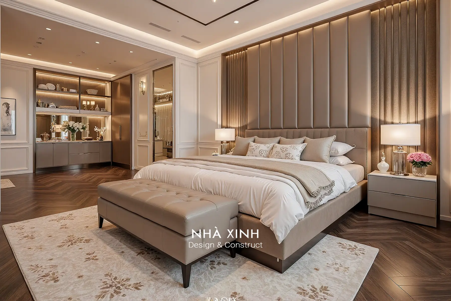 Phòng ngủ chạm đúng cảm giác “resort tại gia” nhờ bố cục cân đối, giường lớn đặt trung tâm và lớp ánh sáng hắt trần dịu như phủ một tấm lụa lên không gian. Đầu giường xử lý phẳng chia mảng tinh tế, kết hợp nệm bọc mềm khiến tổng thể vừa sang vừa êm. Tông kem be được nâng lên rõ rệt bởi những điểm nhấn ánh kim và đèn chùm lấp lánh, nhìn vào là thấy “đắt” mà vẫn nhẹ nhàng.