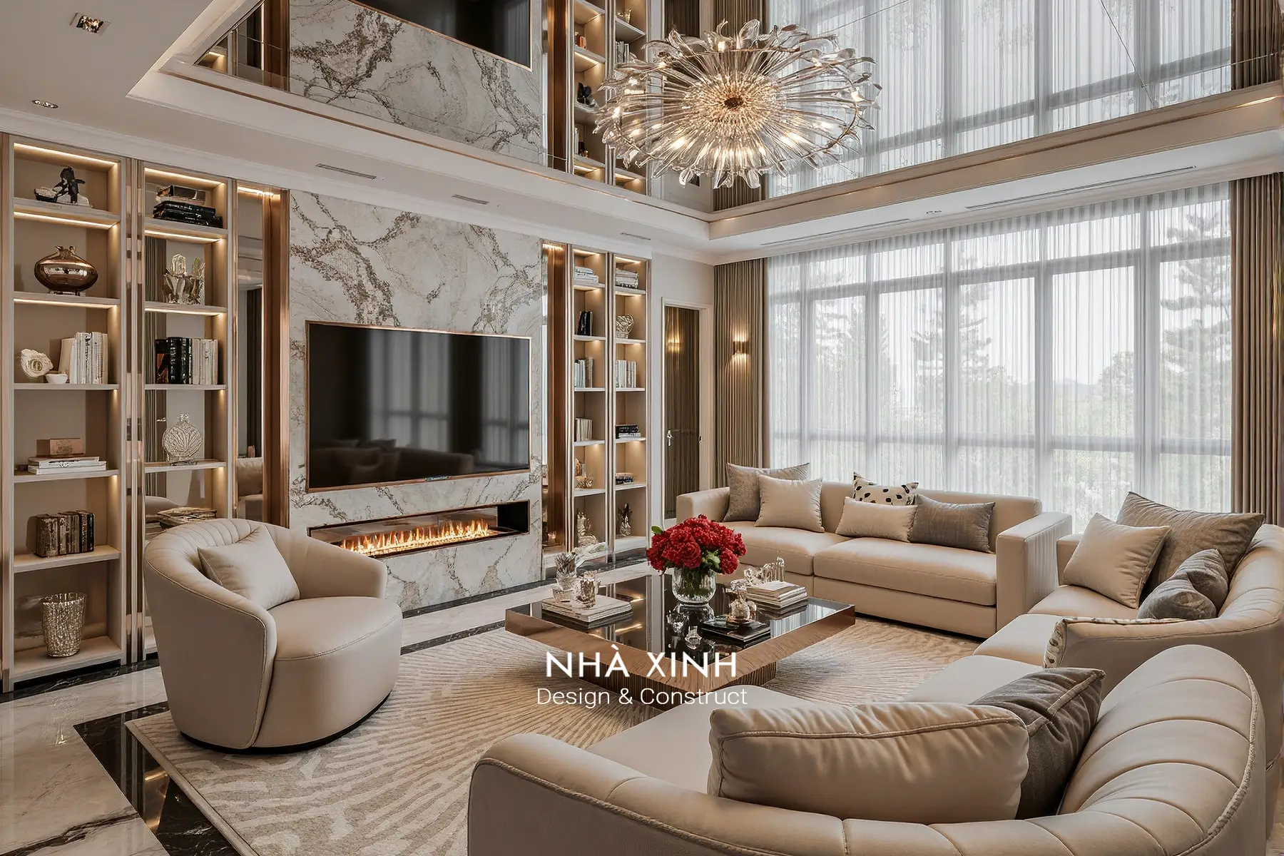 Phòng khách “ăn điểm” mạnh ở mảng đá vân lớn sau tivi, vừa là điểm nhấn sang trọng vừa làm nền hoàn hảo cho ngọn lửa trang trí bên dưới tạo cảm giác ấm cúng. Sofa kem bo cong ôm lấy khu trung tâm, kết hợp đèn chùm như một đóa hoa pha lê khiến cả không gian trông vừa quyền lực vừa mềm mại, đúng chất Neo Luxe.