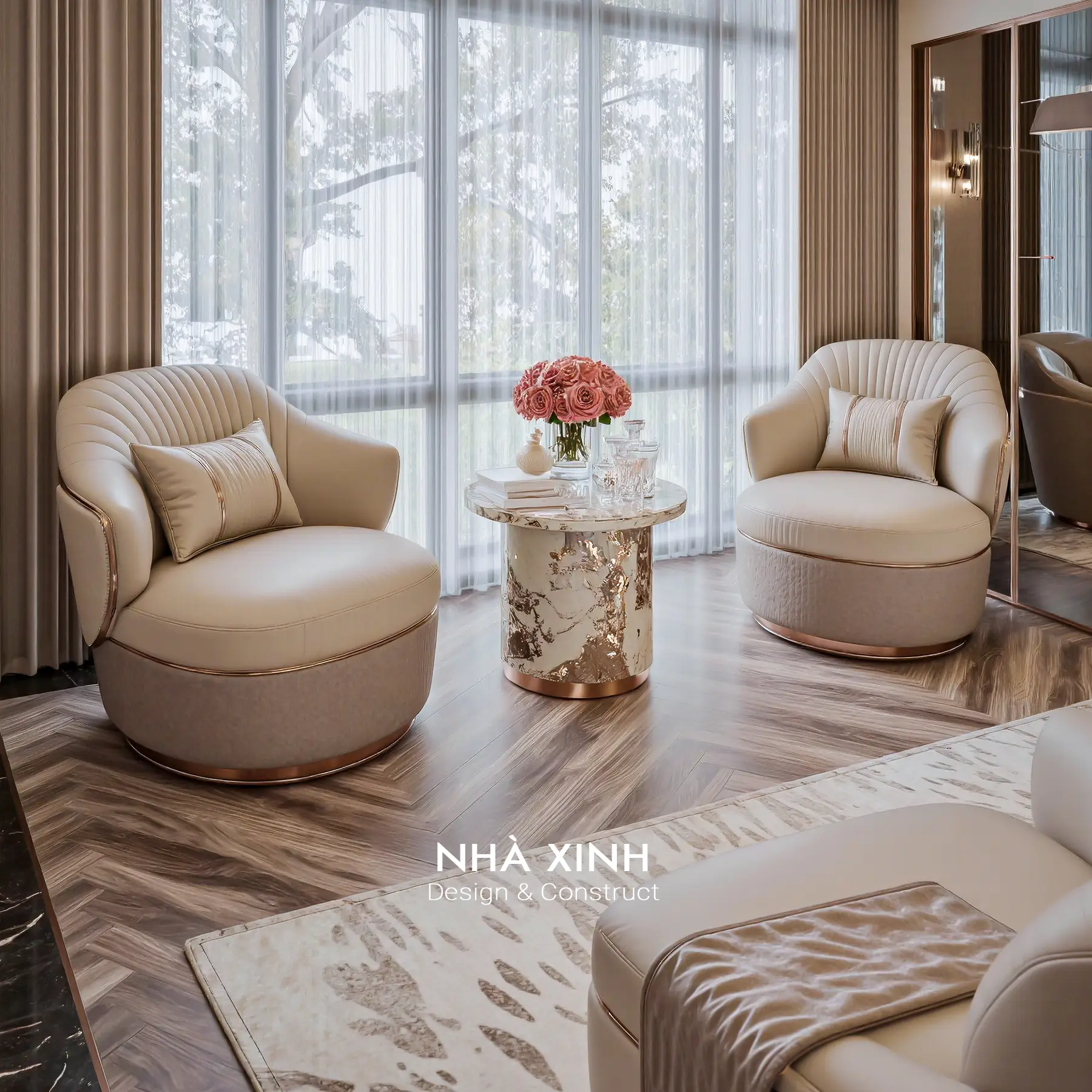 Góc thư giãn bên cửa sổ tạo cảm giác rất “chill”, chỉ cần ngồi xuống là thấy mọi thứ chậm lại nhờ ánh sáng lọc qua lớp rèm mỏng. Hai ghế đơn màu kem với viền kim loại nhẹ nhàng, bàn tròn đá vân và hoa hồng làm điểm nhấn, tạo nên một góc nhỏ sang tinh tế như lounge riêng trong biệt thự.
