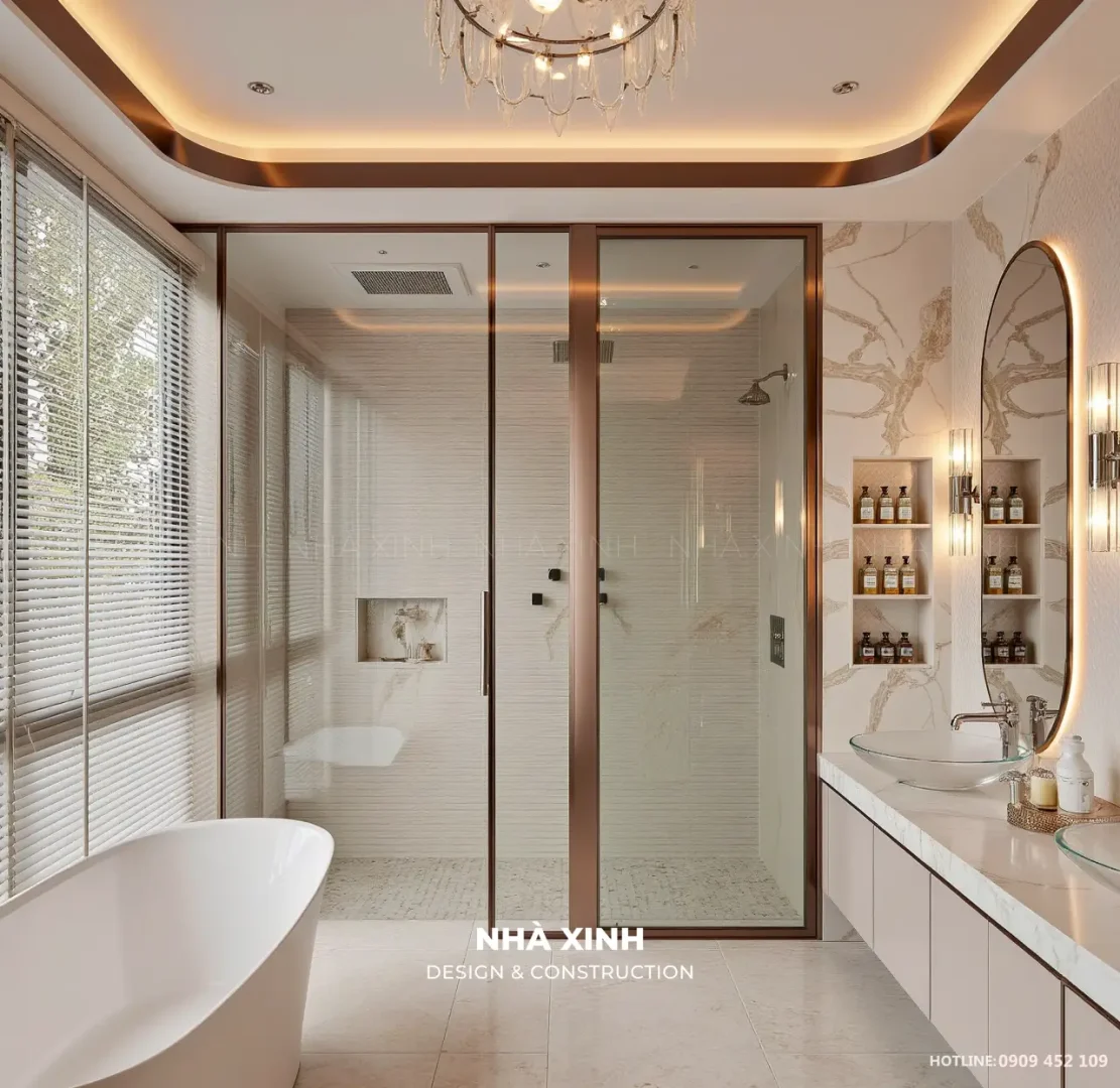 Thiết kế biệt thự 4 tầng có phòng vệ sinh hiện đại với gam màu chủ đạo là đen và trắng. Phòng vệ sinh ốp gạch đá marble vân xám cho diện tường tạo cảm giác luôn sạch sẽ, sáng bóng cho căn phòng. Căn phòng sử dụng vòi sen hiện đại tạo cảm giác sảng khoái cho người sử dụng. Thiết kế nội thất biệt WC hướng đến sự tiện nghi và tối ưu công năng cho người sử dụng.