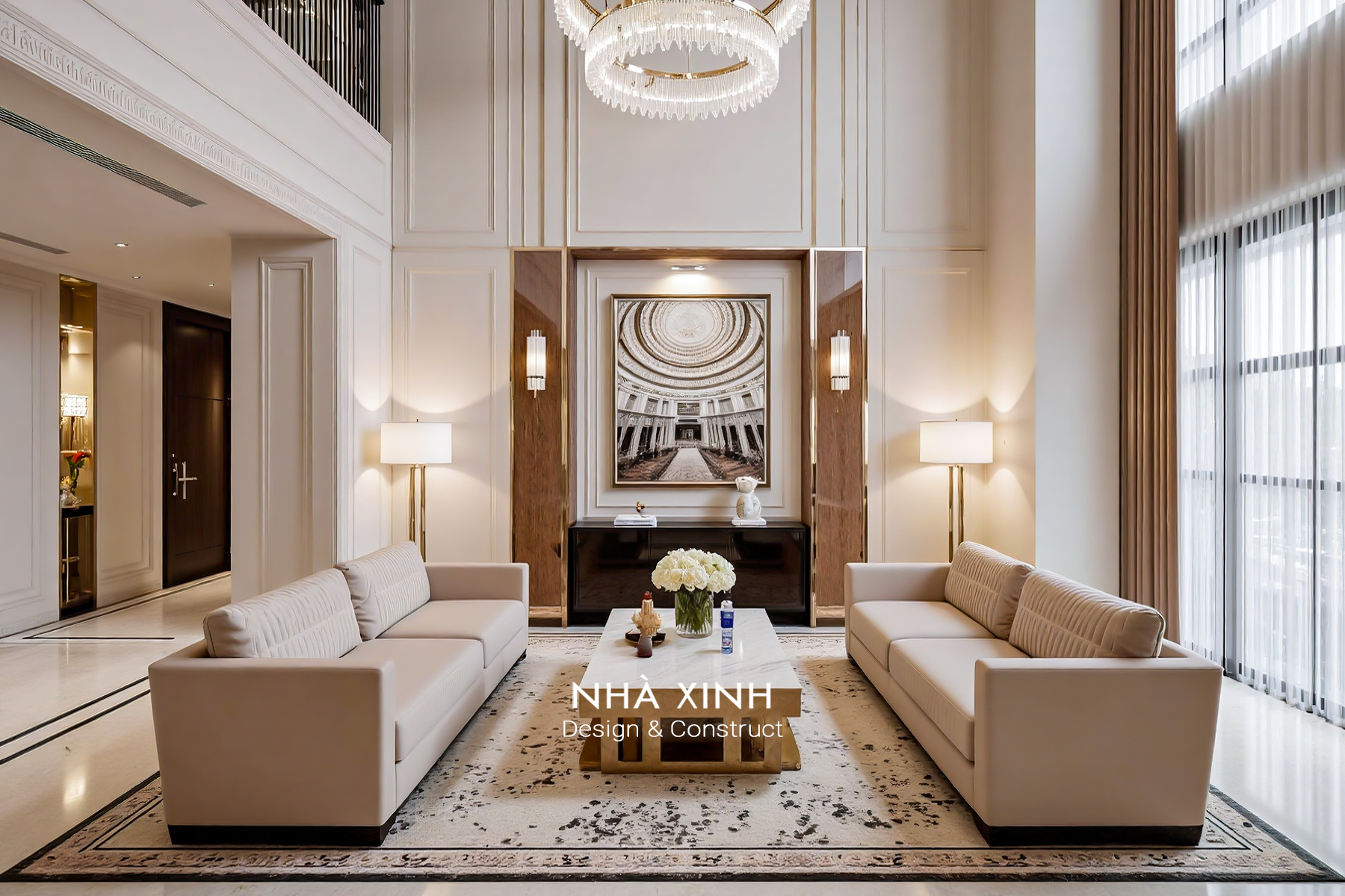Phòng khách rộng rãi với trần cao, đèn chùm pha lê nhập khẩu và bộ sofa bọc da thật cao cấp. Sàn lát đá tự nhiên bóng mịn, kết hợp thảm trải sang trọng tạo nên một không gian tiếp khách ấn tượng.