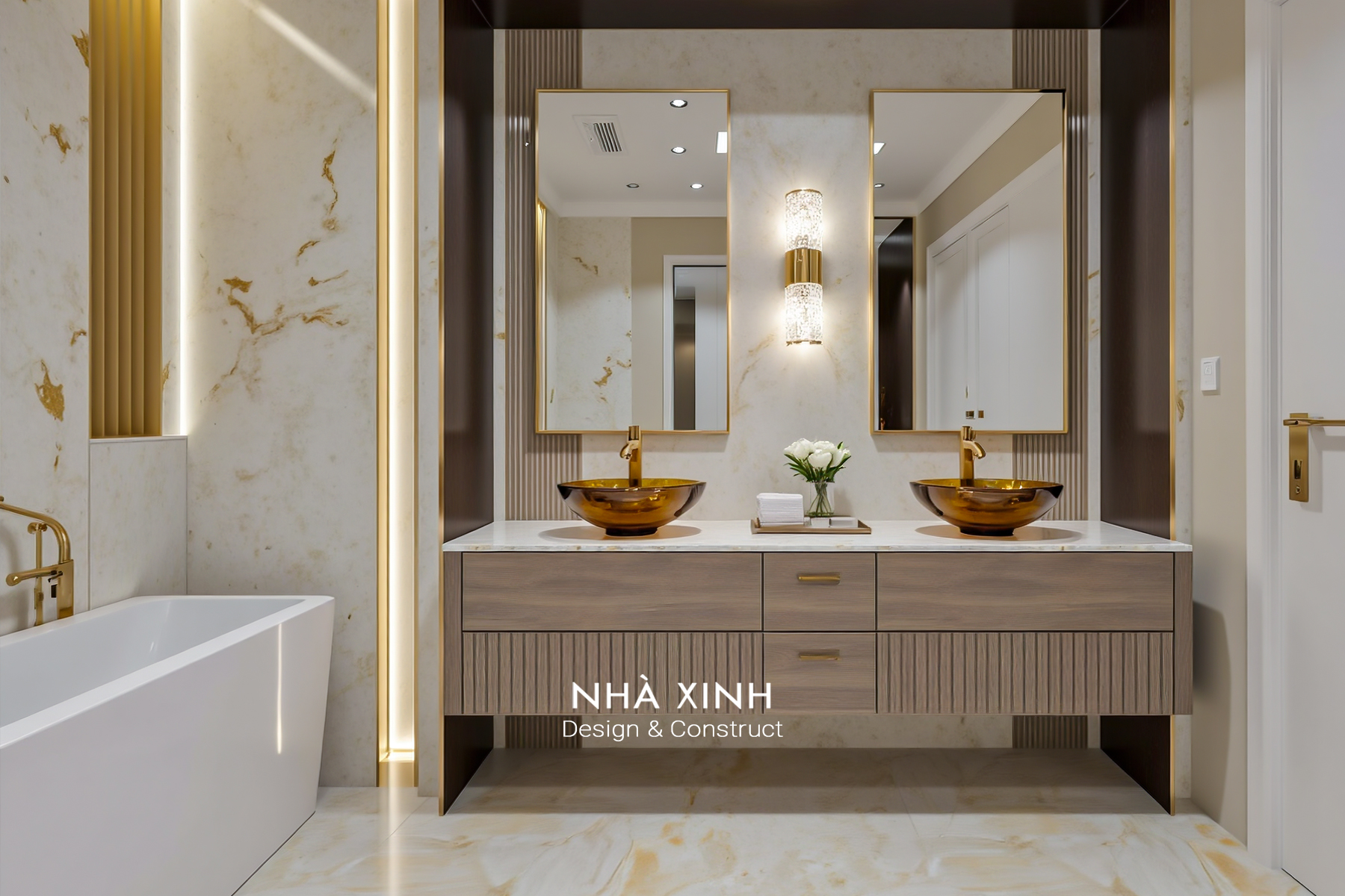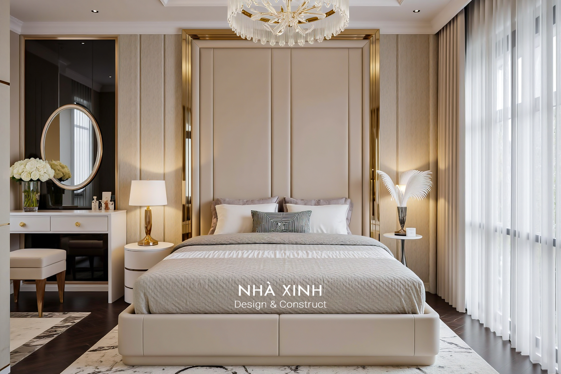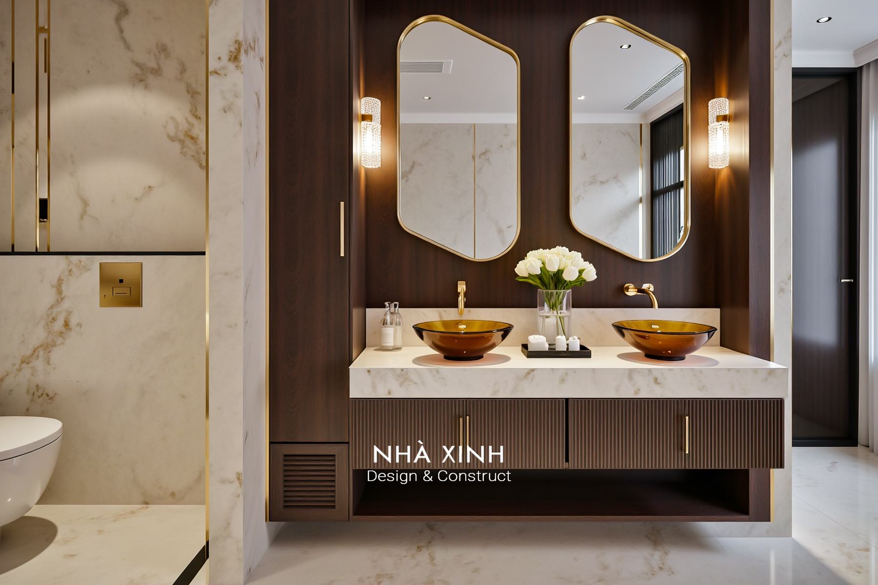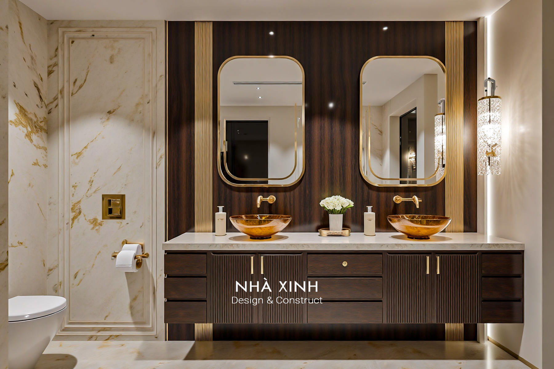 Biệt thự sử dụng đá marble nhập khẩu, gỗ óc chó Bắc Mỹ cho nội thất và kim loại mạ vàng cho các chi tiết trang trí. Sự kết hợp này vừa đảm bảo độ bền, vừa tôn vinh vẻ đẹp sang trọng vượt thời gian.
