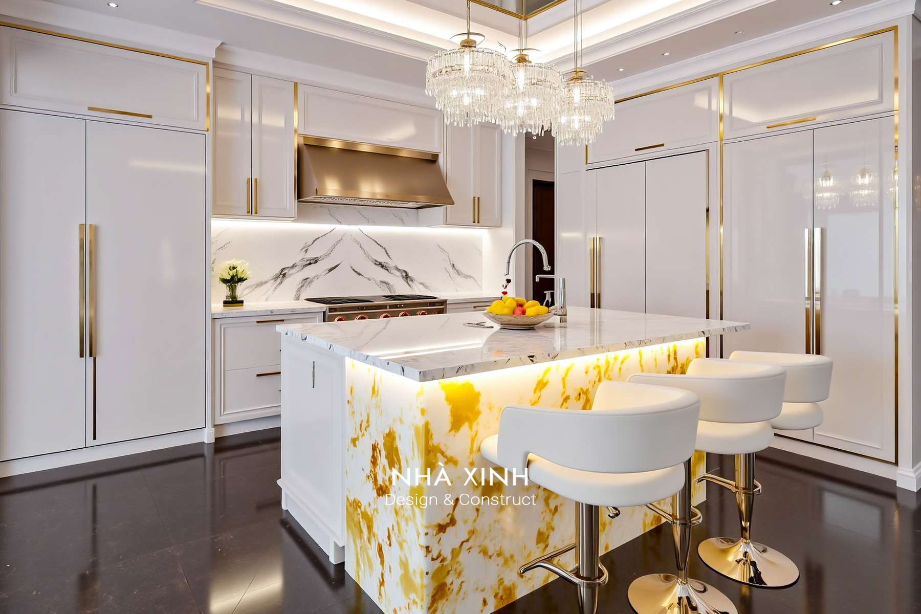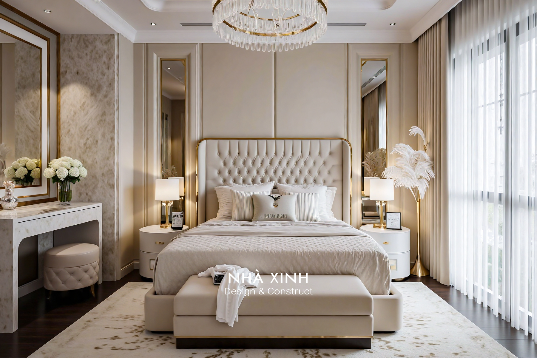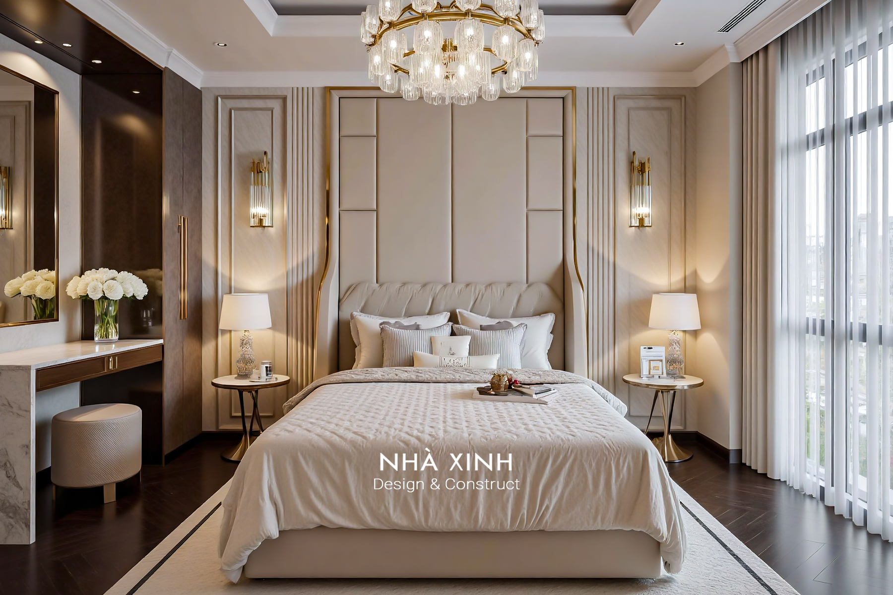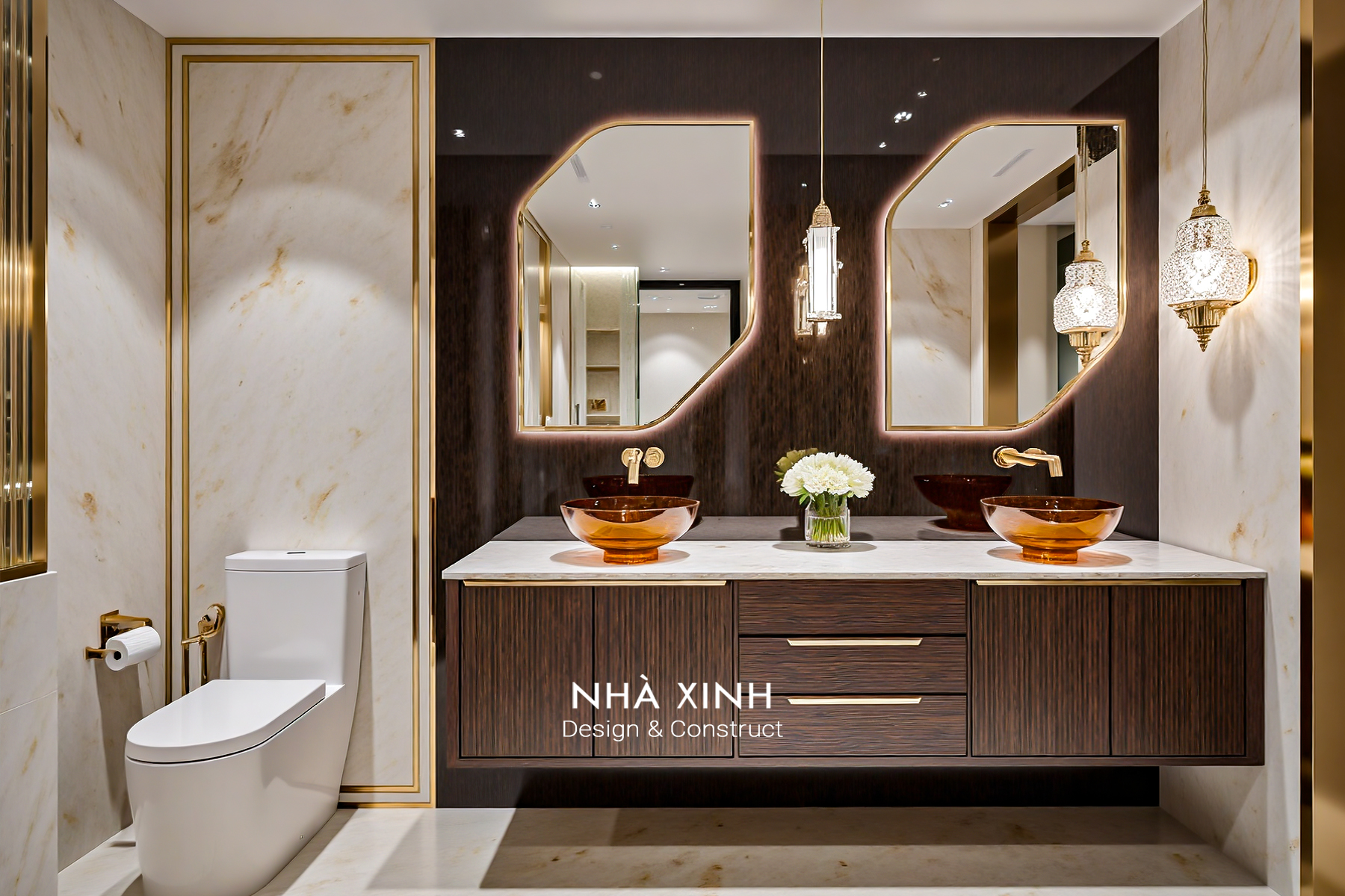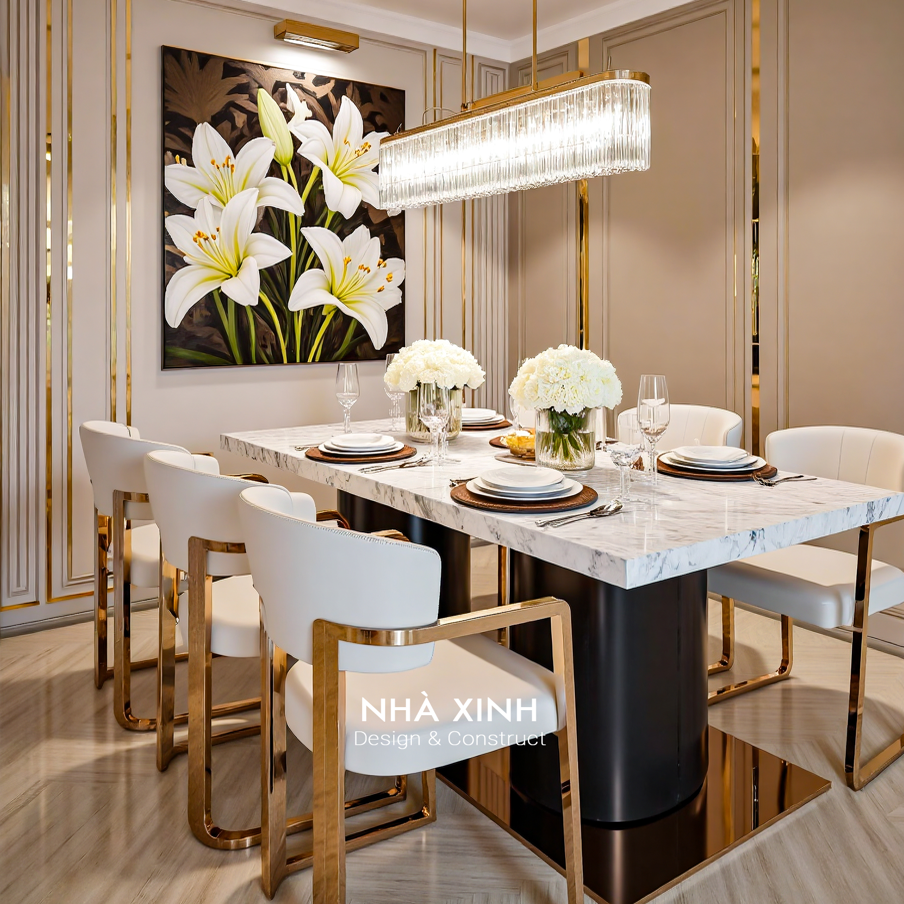 Biệt thự sử dụng đá marble nhập khẩu, gỗ óc chó Bắc Mỹ cho nội thất và kim loại mạ vàng cho các chi tiết trang trí. Sự kết hợp này vừa đảm bảo độ bền, vừa tôn vinh vẻ đẹp sang trọng vượt thời gian.