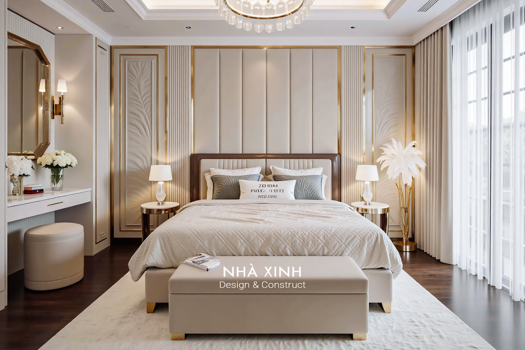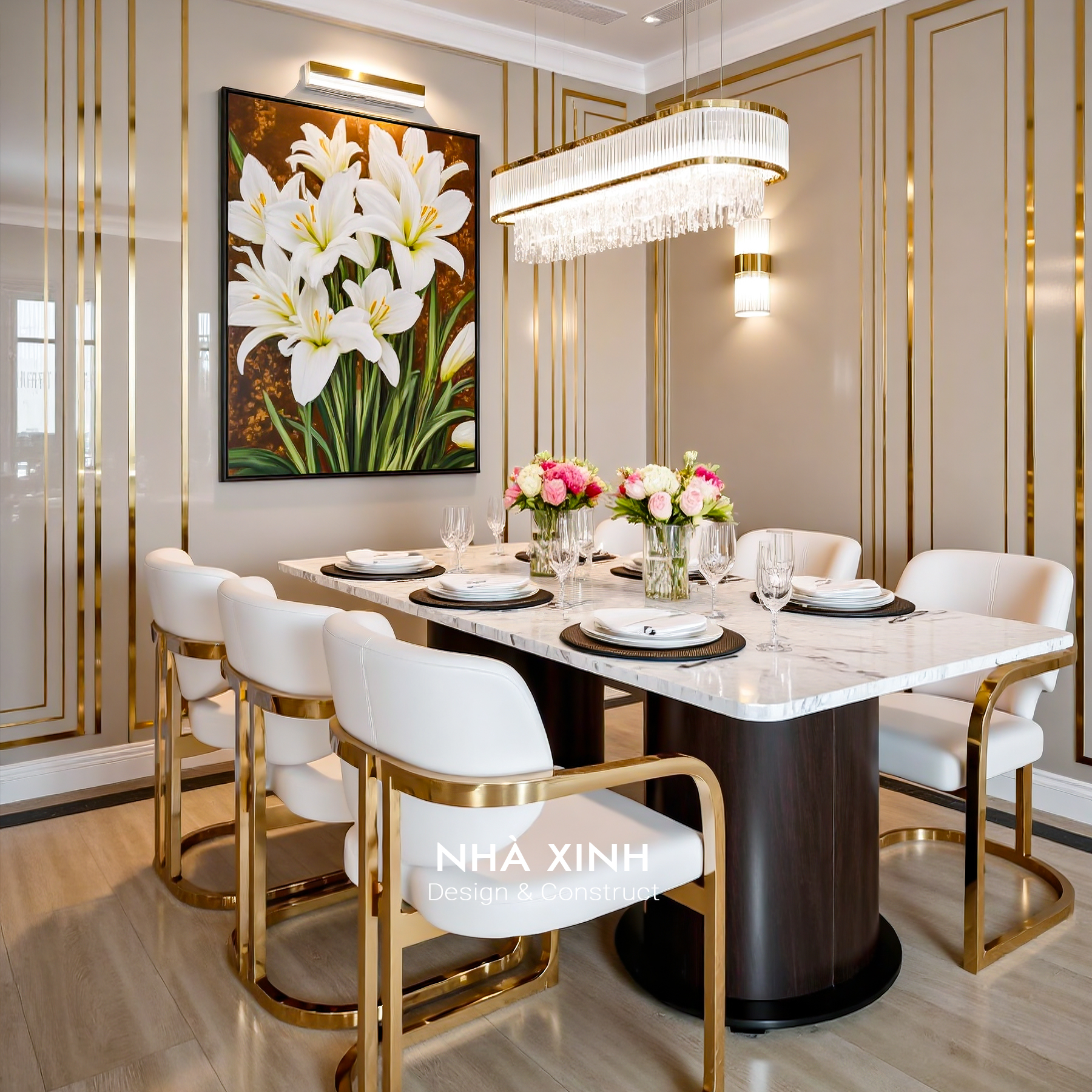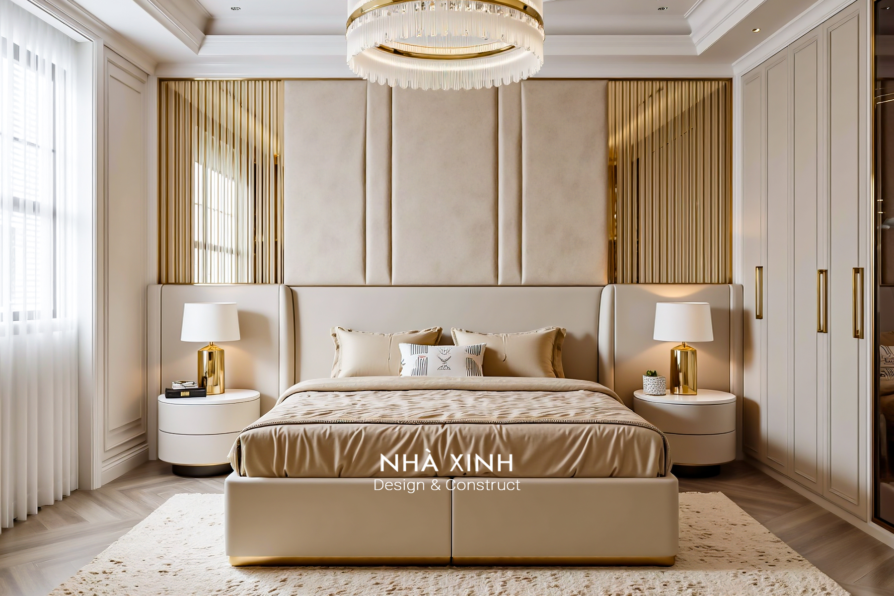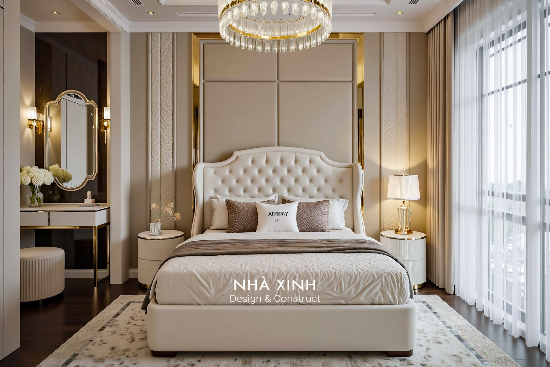 Biệt thự sử dụng đá marble nhập khẩu, gỗ óc chó Bắc Mỹ cho nội thất và kim loại mạ vàng cho các chi tiết trang trí. Sự kết hợp này vừa đảm bảo độ bền, vừa tôn vinh vẻ đẹp sang trọng vượt thời gian.