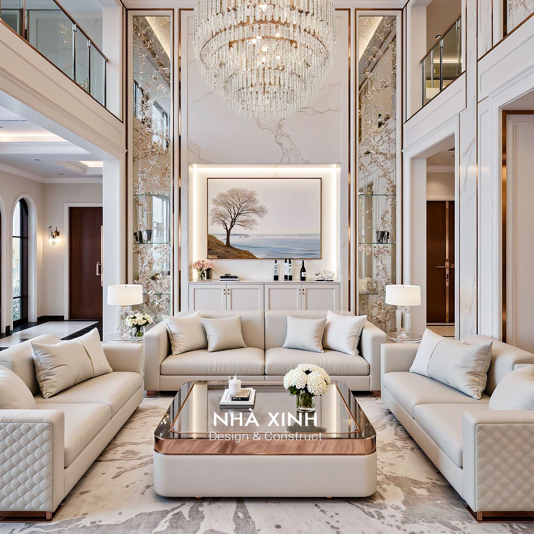 Phòng khách rộng rãi với trần cao, đèn chùm pha lê nhập khẩu và bộ sofa bọc da cao cấp. Sàn lát đá tự nhiên bóng mịn kết hợp với thảm trải hoa văn sang trọng, tạo nên không gian tiếp khách ấn tượng.