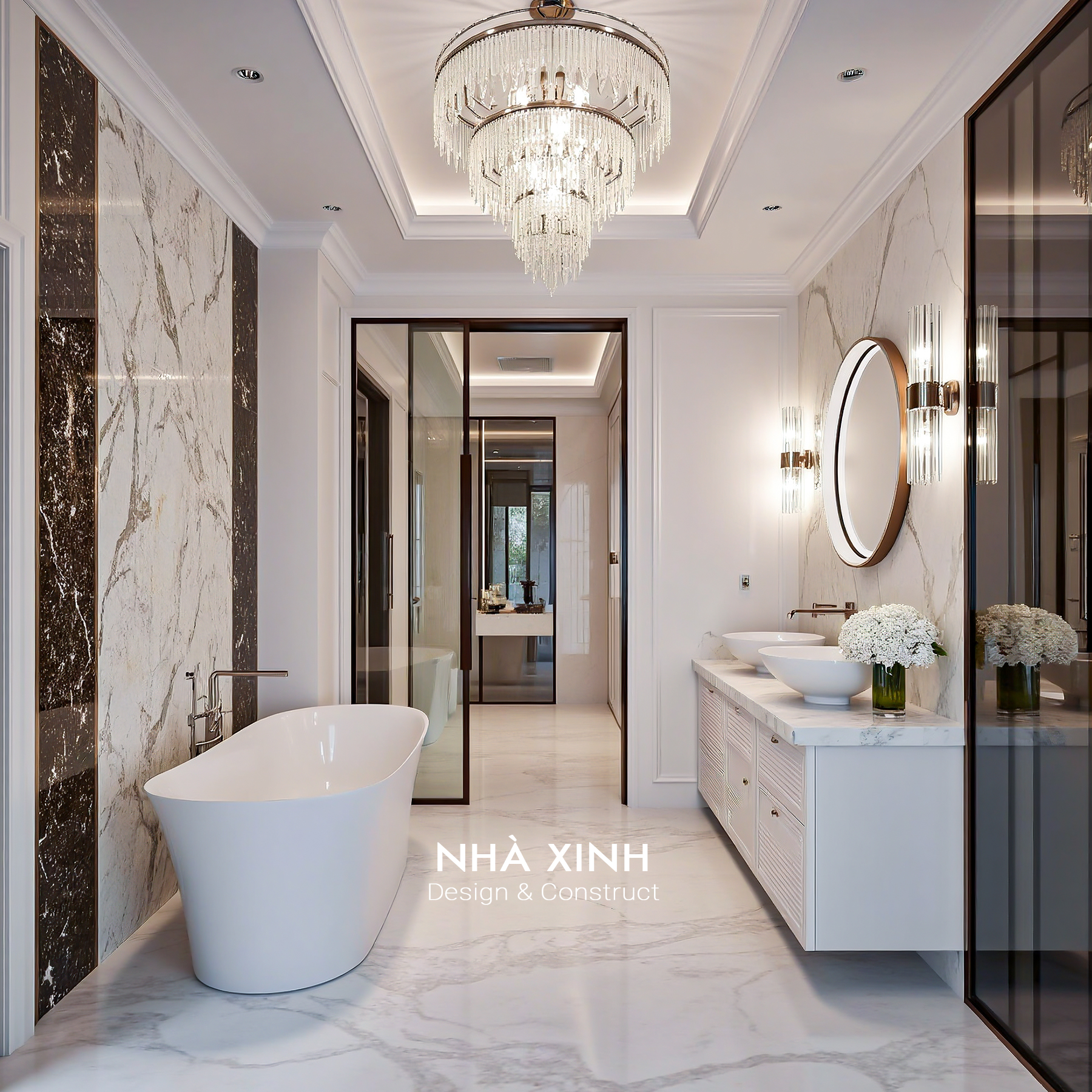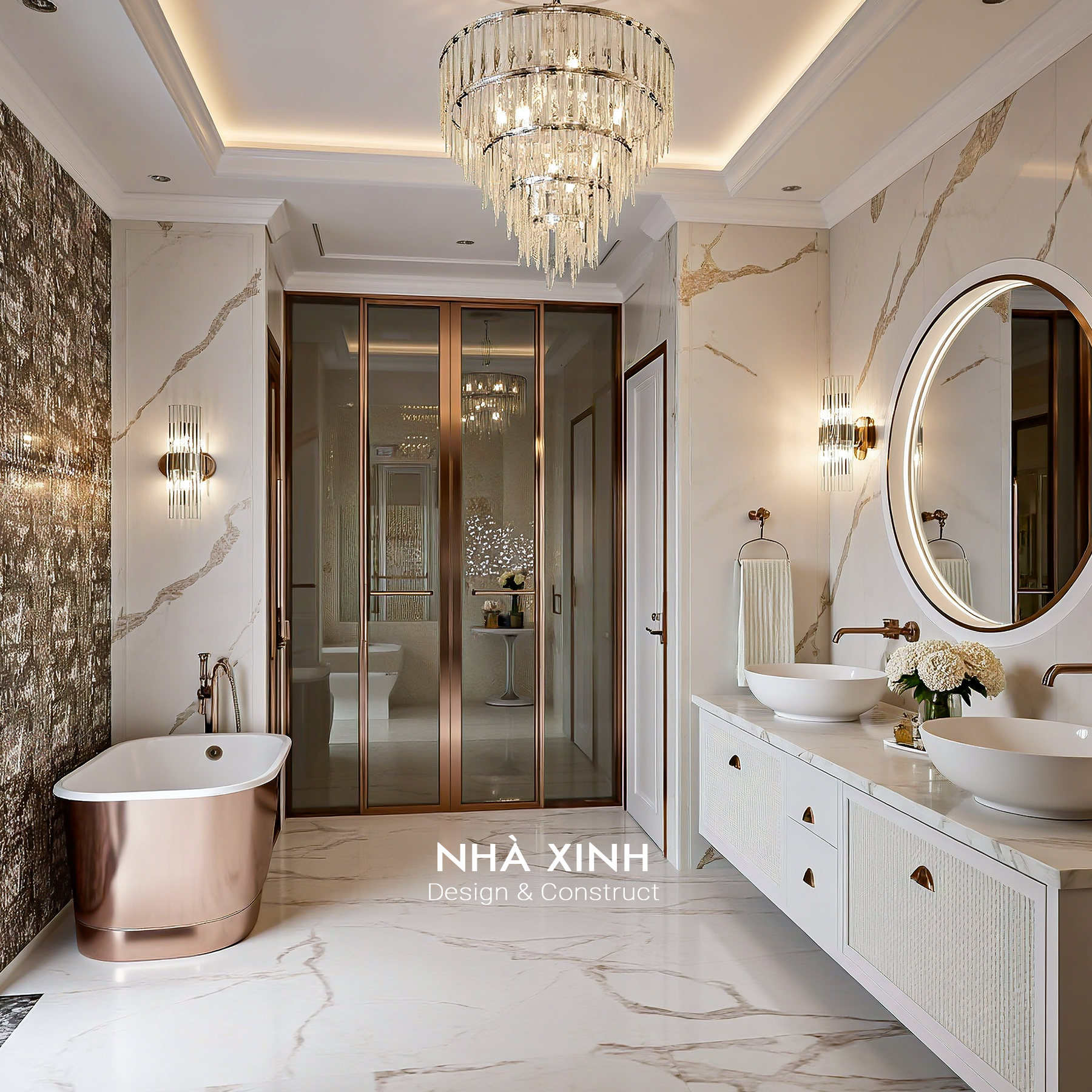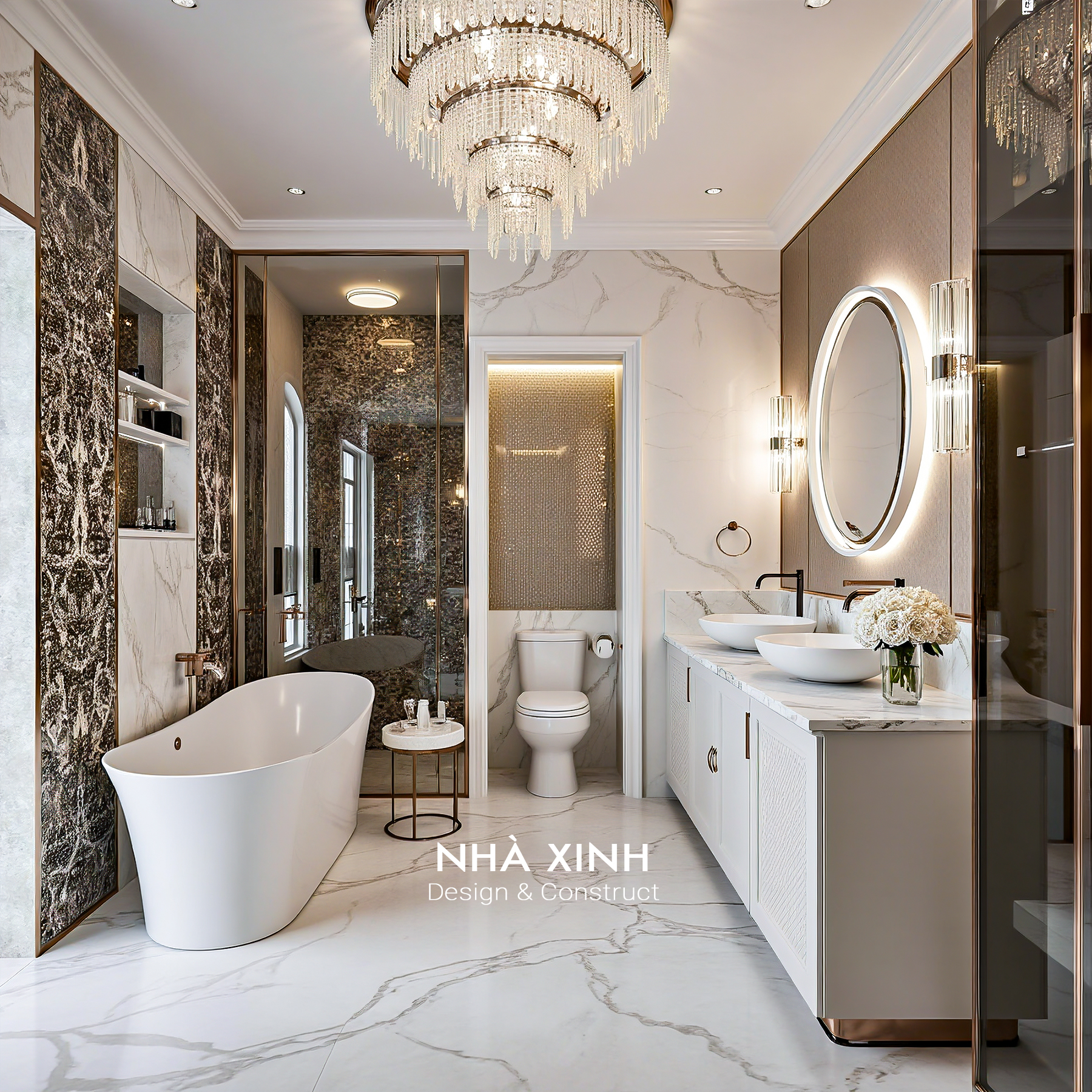 Biệt thự sử dụng đá marble nhập khẩu, gỗ óc chó Bắc Mỹ và kim loại mạ vàng cho các chi tiết trang trí. Sự kết hợp này vừa đảm bảo độ bền, vừa nâng tầm đẳng cấp tổng thể công trình.