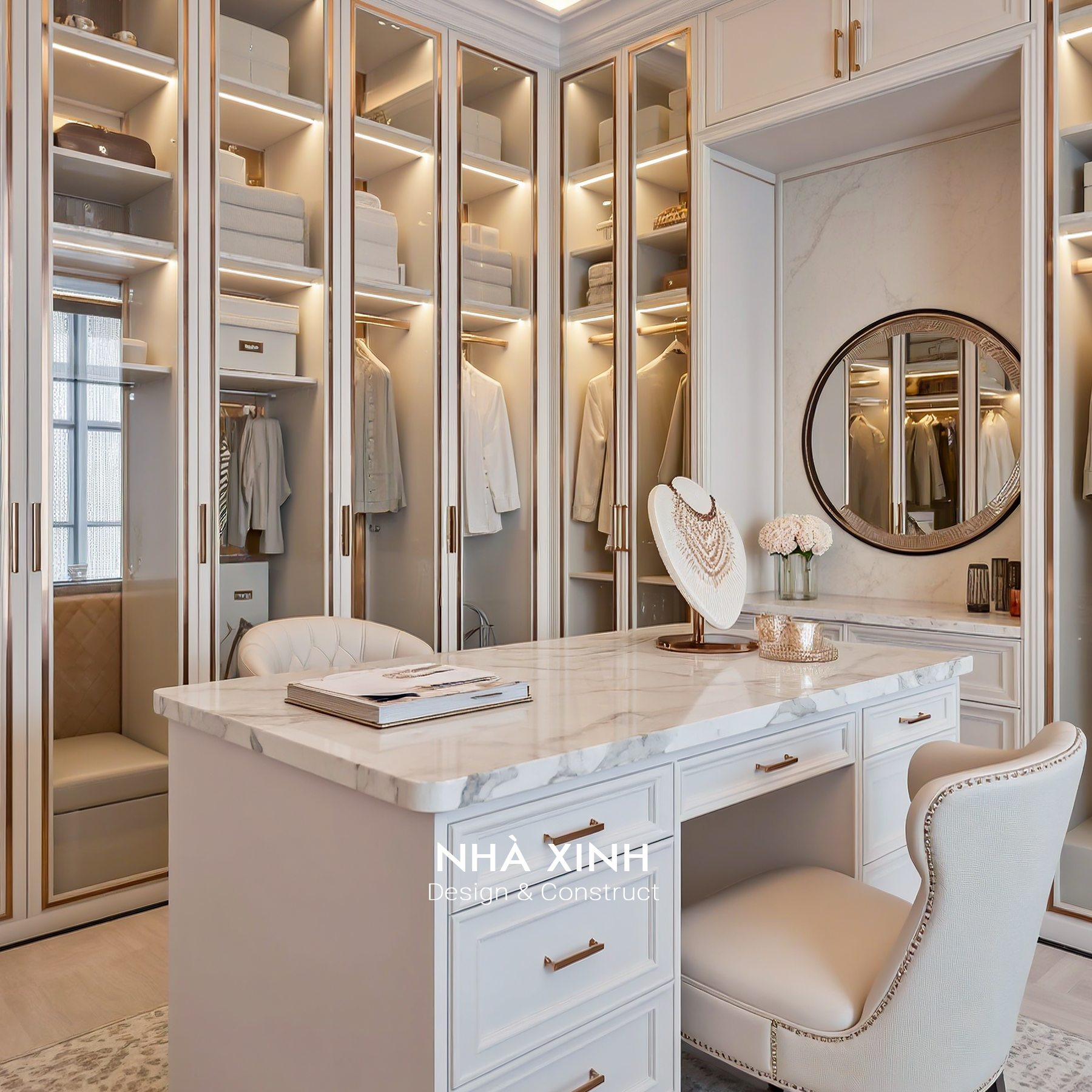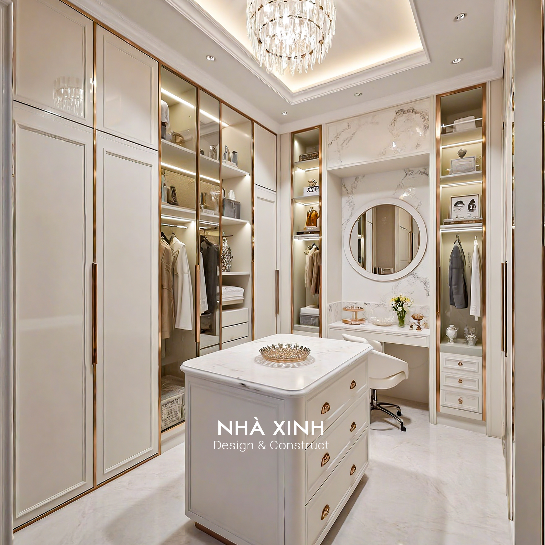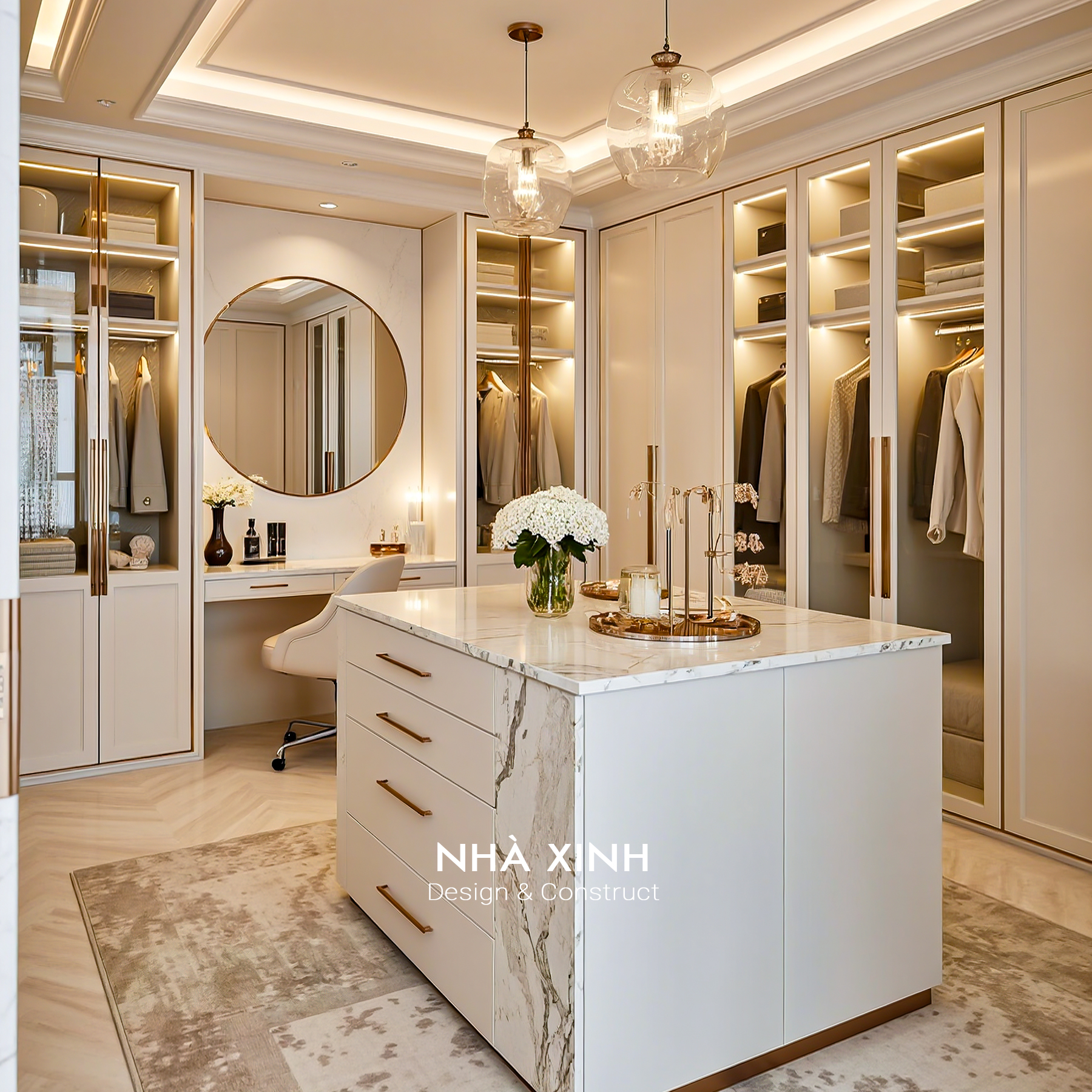 Biệt thự sử dụng đá marble nhập khẩu, gỗ óc chó Bắc Mỹ và kim loại mạ vàng cho các chi tiết trang trí. Sự kết hợp này vừa đảm bảo độ bền, vừa nâng tầm đẳng cấp tổng thể công trình.