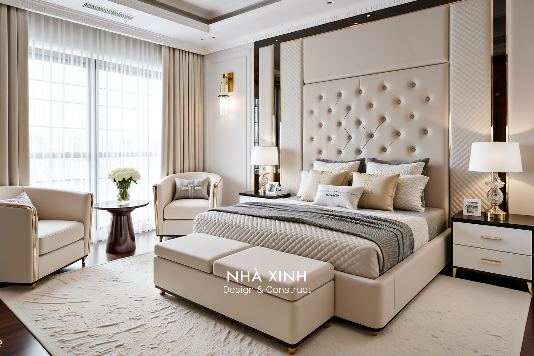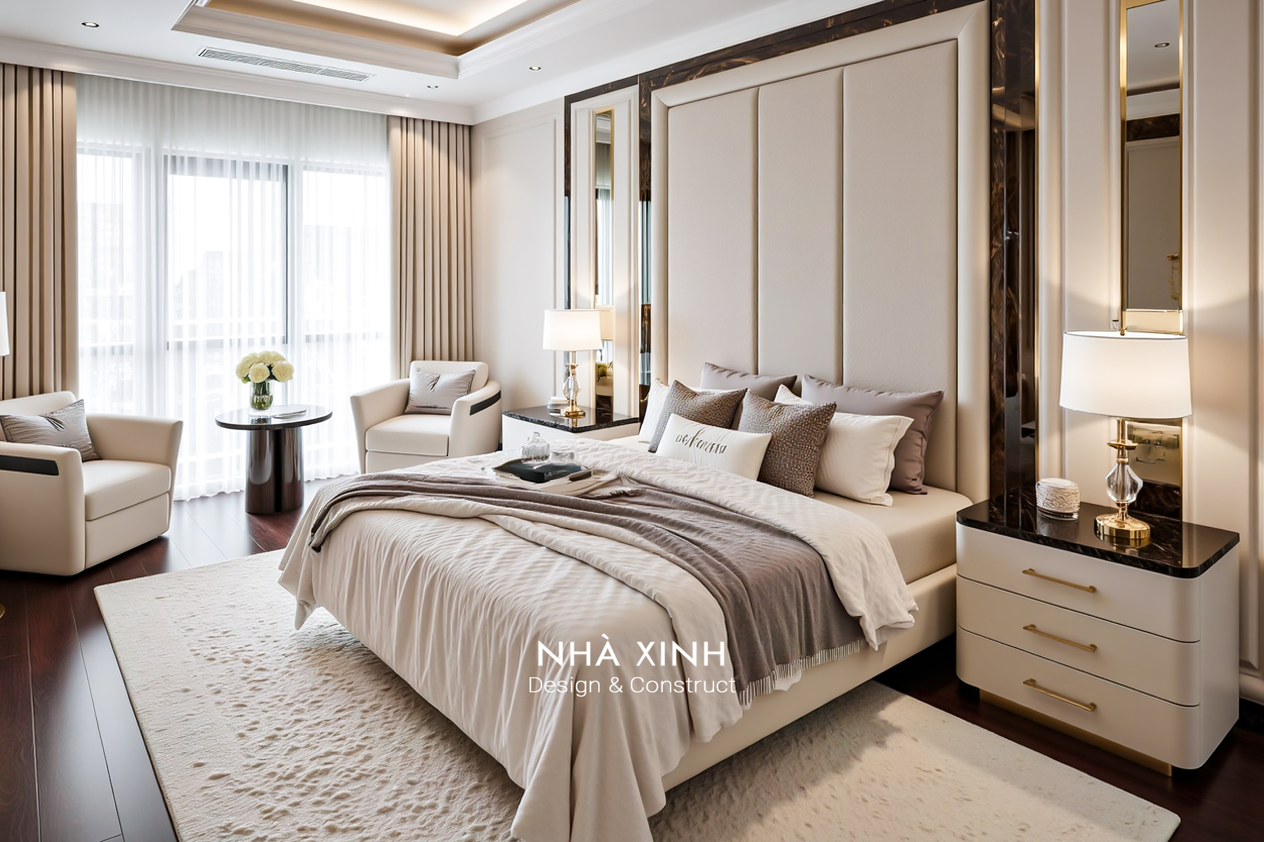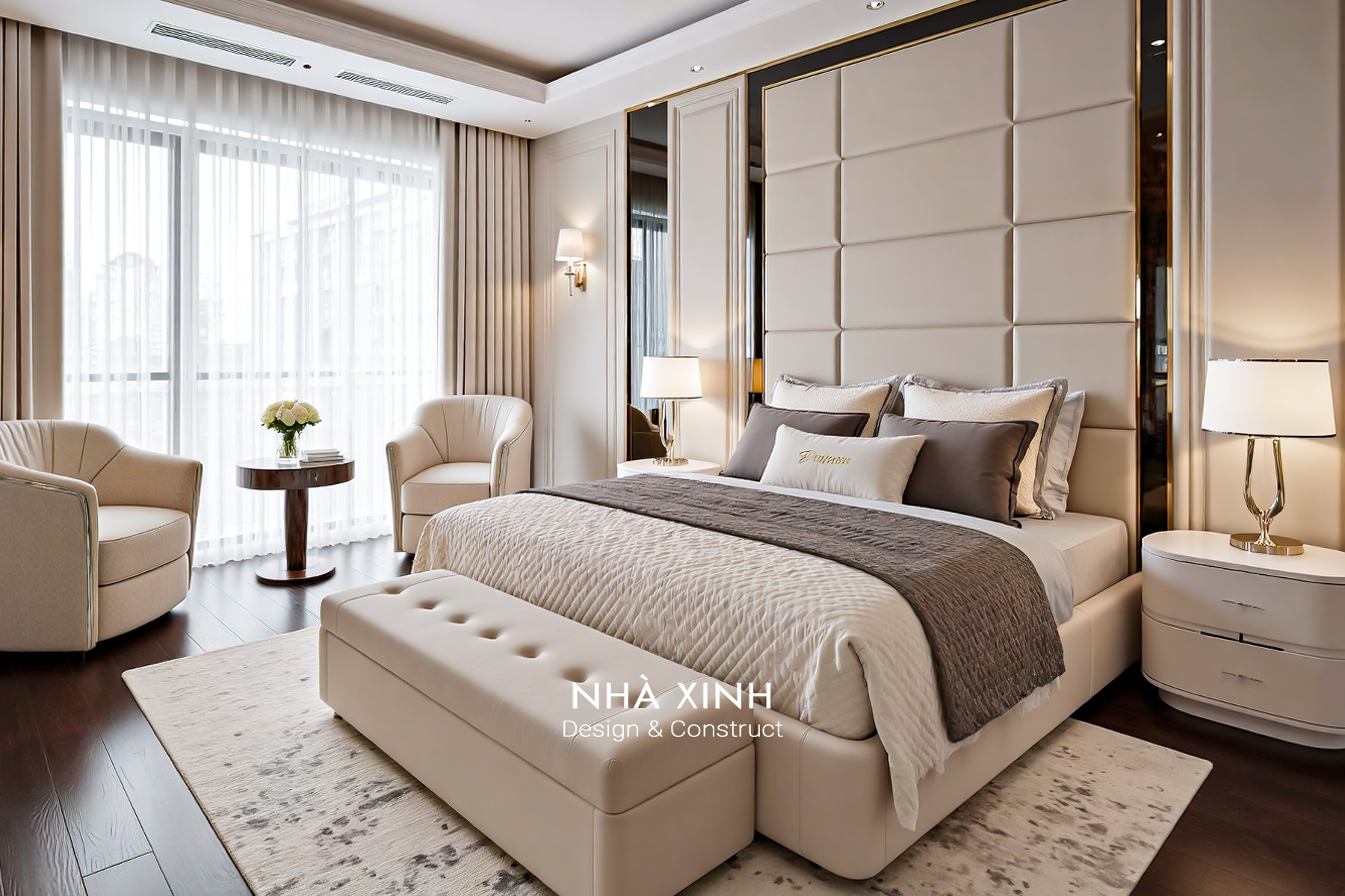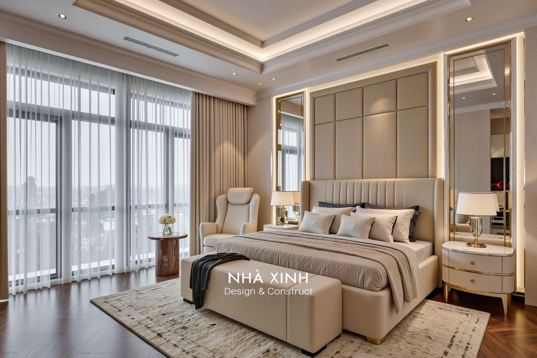 Mỗi phòng ngủ là một không gian nghỉ dưỡng riêng biệt, sử dụng tông màu vàng kem, giường chạm khắc tinh xảo và nội thất bọc vải nhung cao cấp. Ban công mở rộng giúp tận hưởng trọn vẹn tầm nhìn hướng sông và không gian xanh mát.