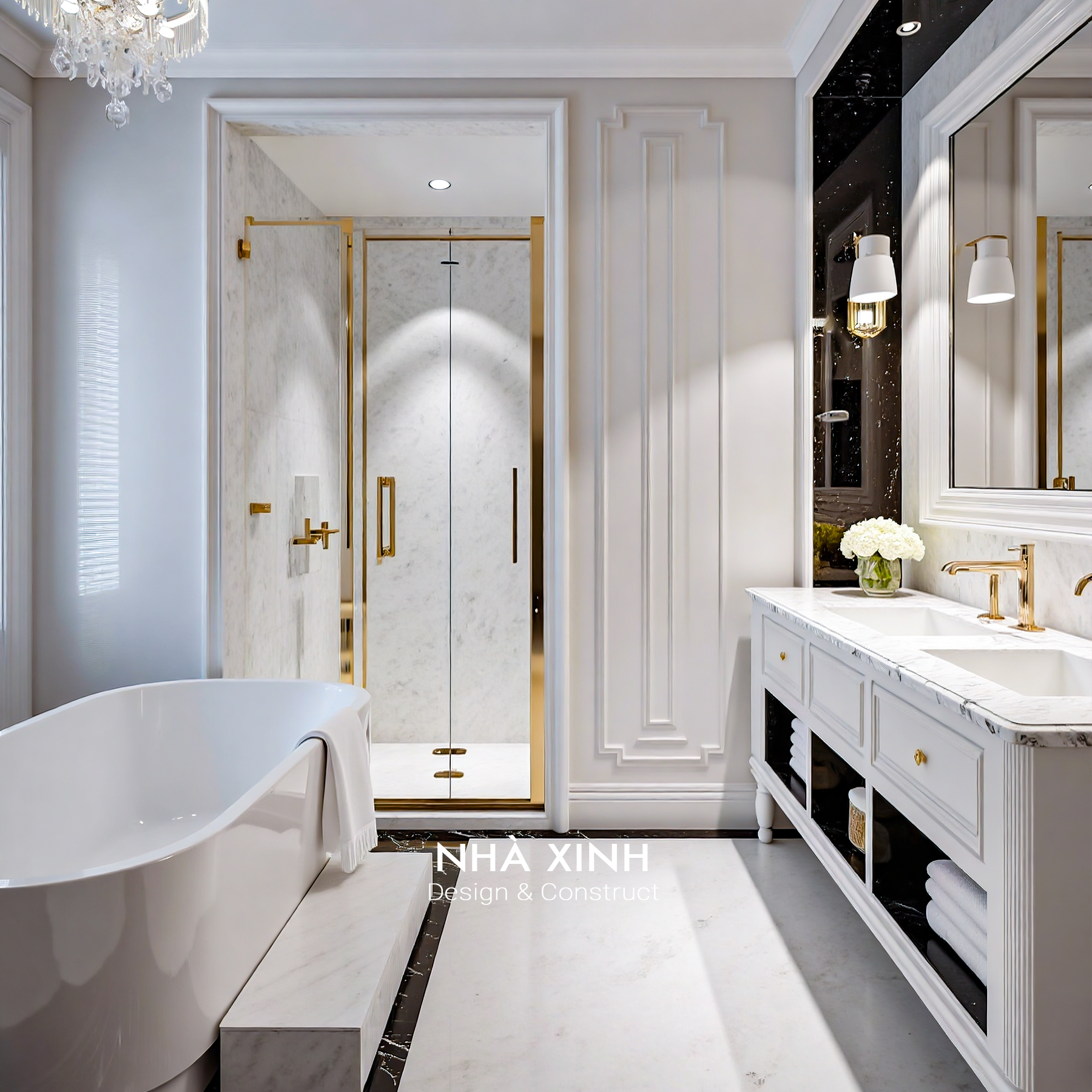 Mặt tiền ốp đá granite và marble nhập khẩu nguyên khối, hệ cửa gỗ lim Nam Phi kết hợp kính cường lực dày, cùng các chi tiết kim loại mạ vàng 24K. Sự kết hợp này vừa tăng giá trị thẩm mỹ, vừa đảm bảo độ bền vượt thời gian.