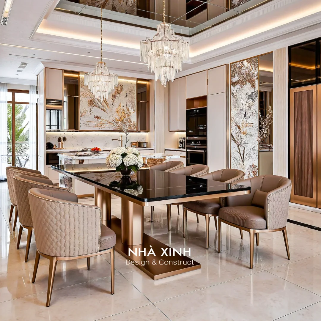 Nội thất tại Rivus Elie Saab Atelier Villas, do Nhà Xinh thiết kế, tập trung vào sự độc đáo và cá nhân hóa, thể hiện qua các chi tiết được chế tác thủ công cầu kỳ. Từ những mảng tường ốp gỗ vân độc đáo, bàn trà đá nguyên khối được điêu khắc tinh tế, đến các tấm vách ngăn bằng kim loại cắt laser hay đèn chùm pha lê được thổi thủ công – mỗi yếu tố đều là một tác phẩm nghệ thuật. Gam màu trung tính làm nền cho các vật liệu cao cấp như da thuộc, lụa, nhung, tạo nên không gian ấm cúng nhưng vẫn đầy sang trọng. Ánh sáng được tính toán để làm nổi bật kết cấu bề mặt và các chi tiết trang trí, tạo chiều sâu và sự lôi cuốn. Rivus Elie Saab Atelier Villas không chỉ là một ngôi nhà, mà là một phòng trưng bày nghệ thuật cá nhân, nơi quý vị được bao quanh bởi vẻ đẹp tinh xảo và sự độc đáo không thể tìm thấy ở bất cứ đâu.