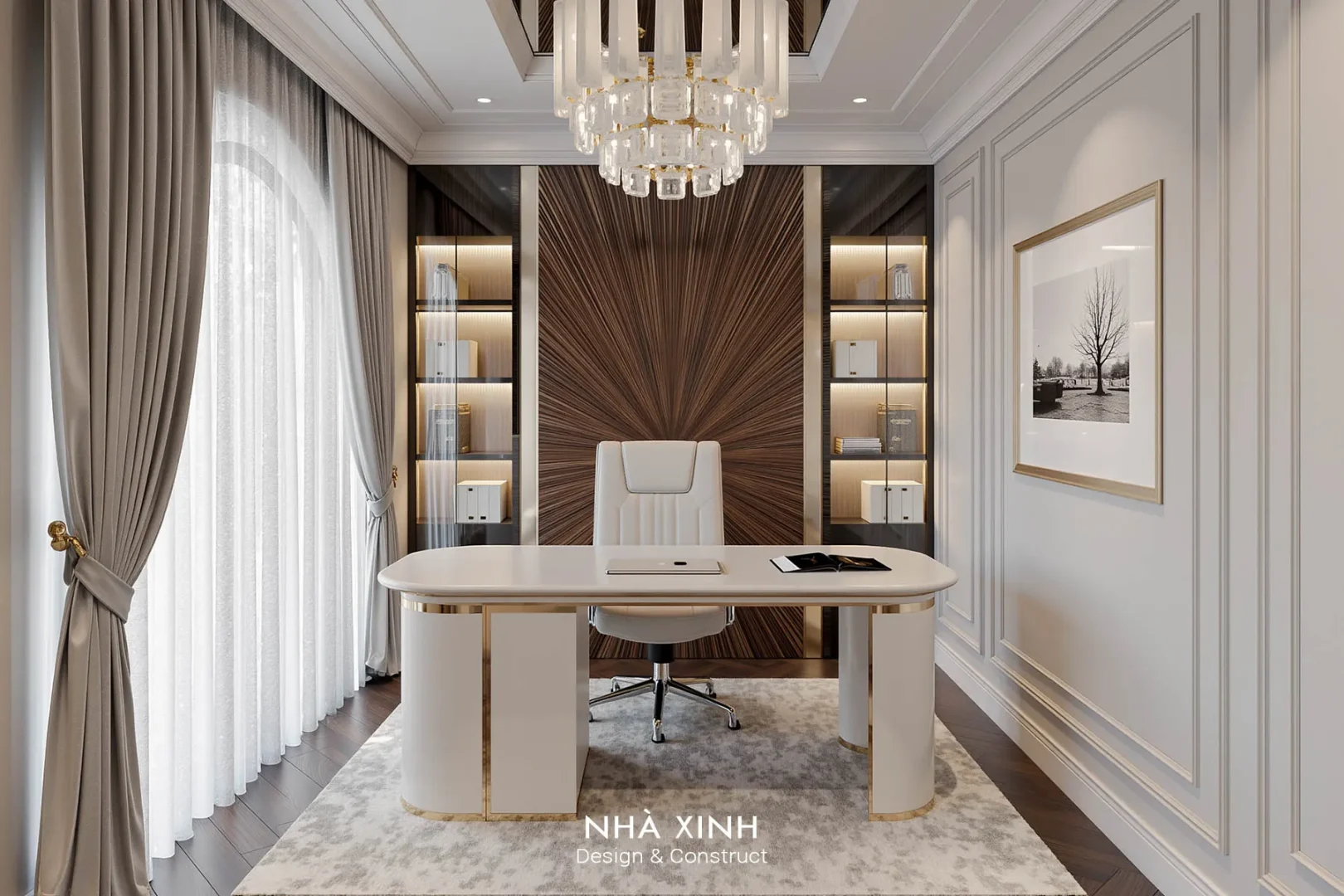 Đặc điểm dễ nhận thấy nhất của thiết kế phòng làm việc hiện đại chính là sự tinh giản trong đường nét và hình khối. Không có những chi tiết chạm khắc cầu kỳ hay hoa văn rườm rà, phong cách này tập trung vào các đường thẳng dứt khoát, hình khối cơ bản như vuông, chữ nhật, tròn, tạo cảm giác gọn gàng, thanh thoát. Nội thất được tối giản hóa chi tiết, chú trọng vào form dáng và chức năng, giúp không gian trở nên thông thoáng, rộng rãi và dễ chịu. Sự tối giản này không hề đơn điệu mà ngược lại, tạo nên vẻ đẹp sang trọng và tinh tế vượt thời gian.